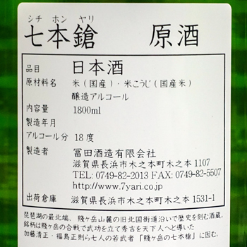 冨田酒造さんの酒蔵のある、長浜市〜木之本で昔から親しまれている地元密着の定番酒(普通酒)です。 ラベルの「七本槍」という文字を見ていただくとわかりますが、現在のラベルで使われている金へんの『七本鎗』ではなく、一般的な木へんの『槍』です。