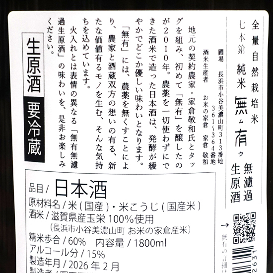 七本鎗 無農薬純米 無有 無濾過生原酒