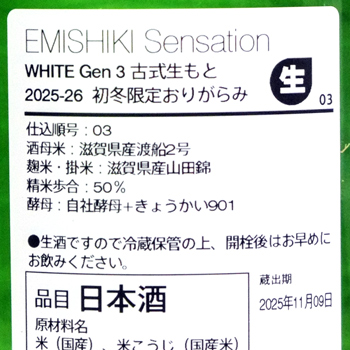 より笑四季らしい鮮烈な芳香と甘みを表現するため、全量古式生もと仕様となっております。白ラベルは酵母由来のフレッシュさと奥ゆかしい吟醸香ときれいな甘味、軽快な切れ味が楽しめ、和の食材との親和性を高めております。