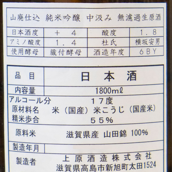 「不老泉 山廃特別純米 赤ラベル」と並び、上原酒造の看板酒と言っていいのが、こちら「不老泉 山廃純米吟醸 中汲み 生原酒」です。