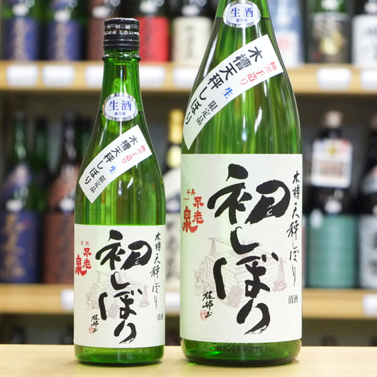 上原酒造の新酒「不老泉 初しぼり」。木槽天秤しぼり の旨みたっぷりの純米酒です。